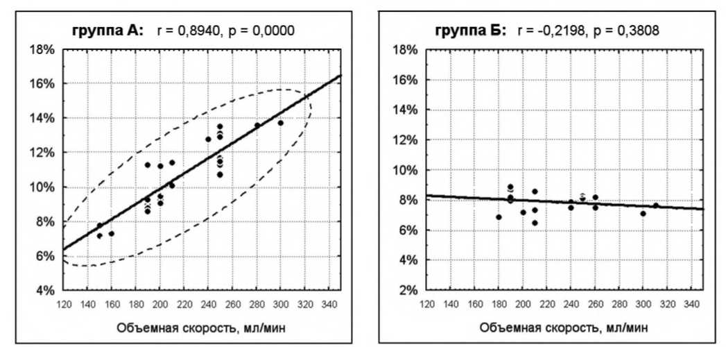 Как видно из рисунка 5, в группе «А» данные абсолютно коррелируемые, r=0,89, где уровень значимости р<0,001. Тогда, как в группе пациентов «Б» корреляции не наблюдалось r=- 0,15, что свидетельствует о независимости импеданса от изменений объемных скоростей ретроградной кардиоплегии.