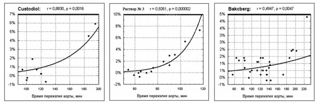 В группах с фармакохолодовой кардиоплегией, наблюдалась высокая степень прямой корреляции (r =0,93 р<0,001 «Раствор №3» и r =0,88 р<0,001 "Custodiol") между временем пережатия аорты и снижением Zbч. В группе "Buckberg", корреляционная связь минимальная r=0,49 (р<0,05), что предусматривает относительную стабильность суммарного объема внутриклеточного пространства во время пережатия аорты.