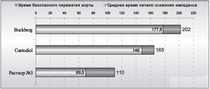 Как видно из диаграммы, кровяная кардиоплегия обеспечивает безопасность при более длительном пережатии аорты, чем кристаллоидные варианты кардиоплегии.