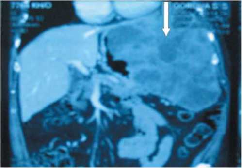 Рис. 1. КТ-брюшной полости с контрастированием. GIST занимает все певое поддиафрагмальное и подреберное пространство (отмечено стрелкой), деформируя и смещая соседние органы и ткани.