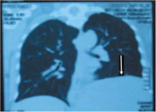 Рис. 2. КТ-органов грудной клетки. Высокое расположение и деформация левого купола диафрагмы (отмечено стрелкой).