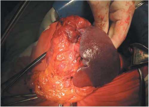 Рис. 3. Операционное поле. Этап мобилизации верхнего полюса опухоли с селезенкой И хвостом поджелудочной железы.