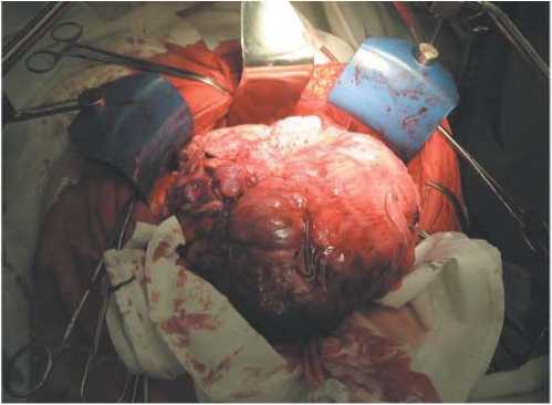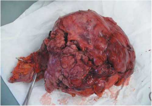 Рис. 4. Операционное поле. Полностью мобилизованная единым блоком опухоль с частью левого купола диафрагмы, хвостом поджелудочной железы и селезенкой.