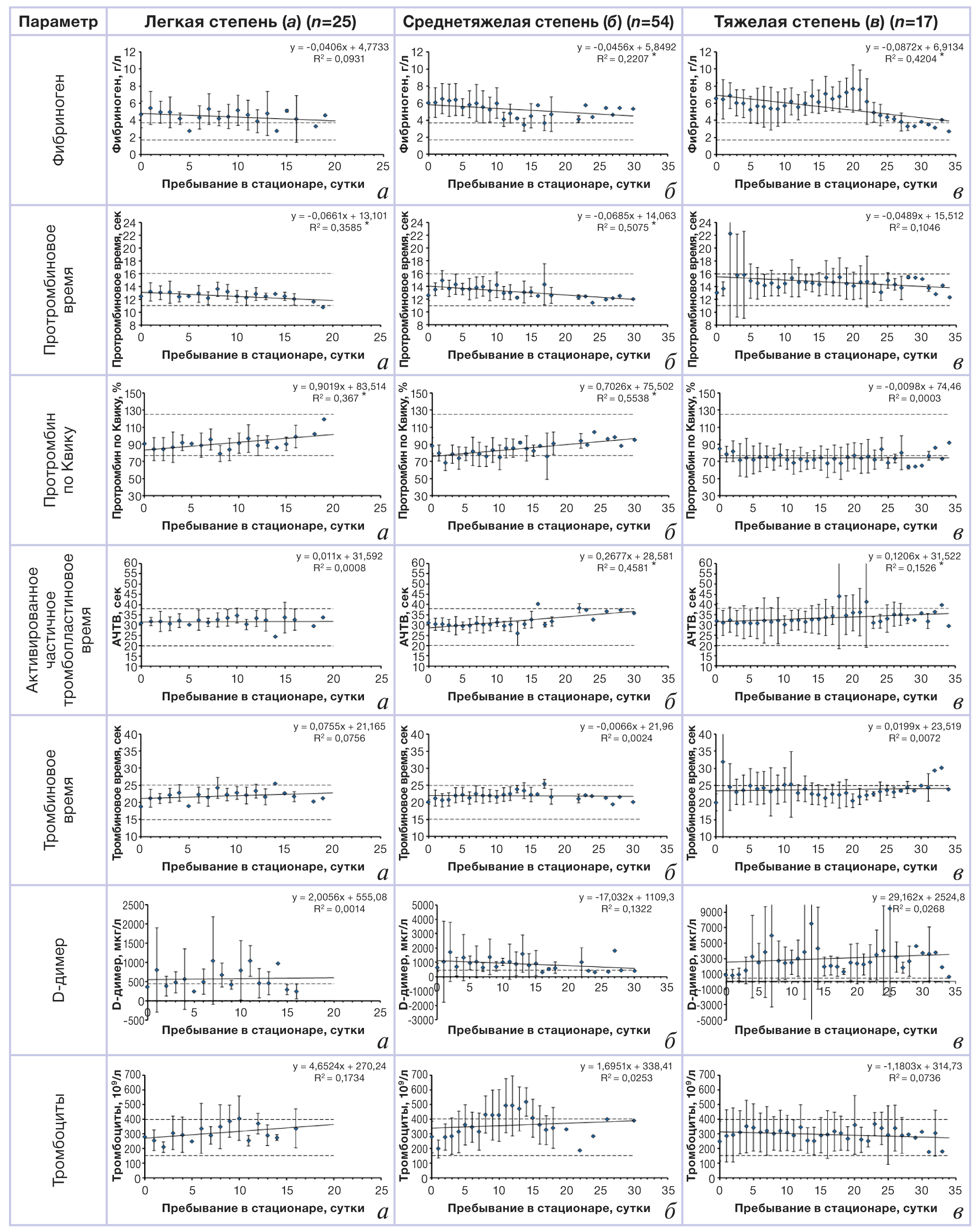Рис. 1. Параметры плазменного звена гемостаза у пациентов с COVID-19 разной степени тяжести в динамике наблюдения. Примечание. Верхняя/нижняя пунктирная линия — референсный интервал, принятый в лаборатории; прямая линия — линия тренда; ось Х — время пребывания в стационаре (в сут), ось Y — параметры плазменного гемостаза. / Fig. 1. Coagulation parameters in patients with COVID-19 of different severity, change over time. Note. The upper / lower dashed line is the laboratory reference interval; straight line — trend line; X-axis — the time of hospital stay (per day), Y-axis — сoagulation parameters.