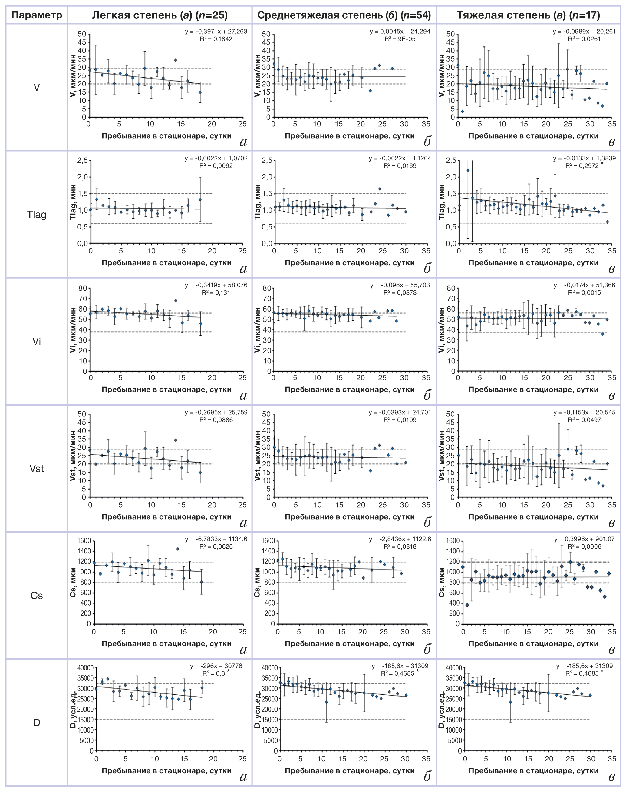 Методы. В исследование включены 96 пациентов с подтвержденным диагнозом COVID-19, госпитализированных в инфекционный госпиталь на базе ФГБУ НМИЦ АГП им. В.И. Кулакова Минздрава России в период с 23.04.2020 по 20.06.2020 и выписанных по окончании лечения. Идентификацию SARS-CoV-2 проводили методом полимеразной цепной реакции. Пациенты были стратифицированы по степени тяжести на 3 группы: легкое течение (n=25), среднетяжелое течение (n=54), тяжелое течение (n=17). Диагностика и лечение пациентов проводилось в соответствии с Временными методическими рекомендациями Минздрава России по профилактике, диагностике и лечению новой коронавирусной инфекции (версии 5, 6, 7). В динамике лечения у пациентов оценивали активированное частичное тромбопластиновое время (АЧТВ), протромбин по Квику, протромбиновое и тромбиновое время, концентрацию фибриногена, D-димера, количество тромбоцитов и параметры теста тромбодинамики (V/Vi/Vst, Tlag, Cs, D).
