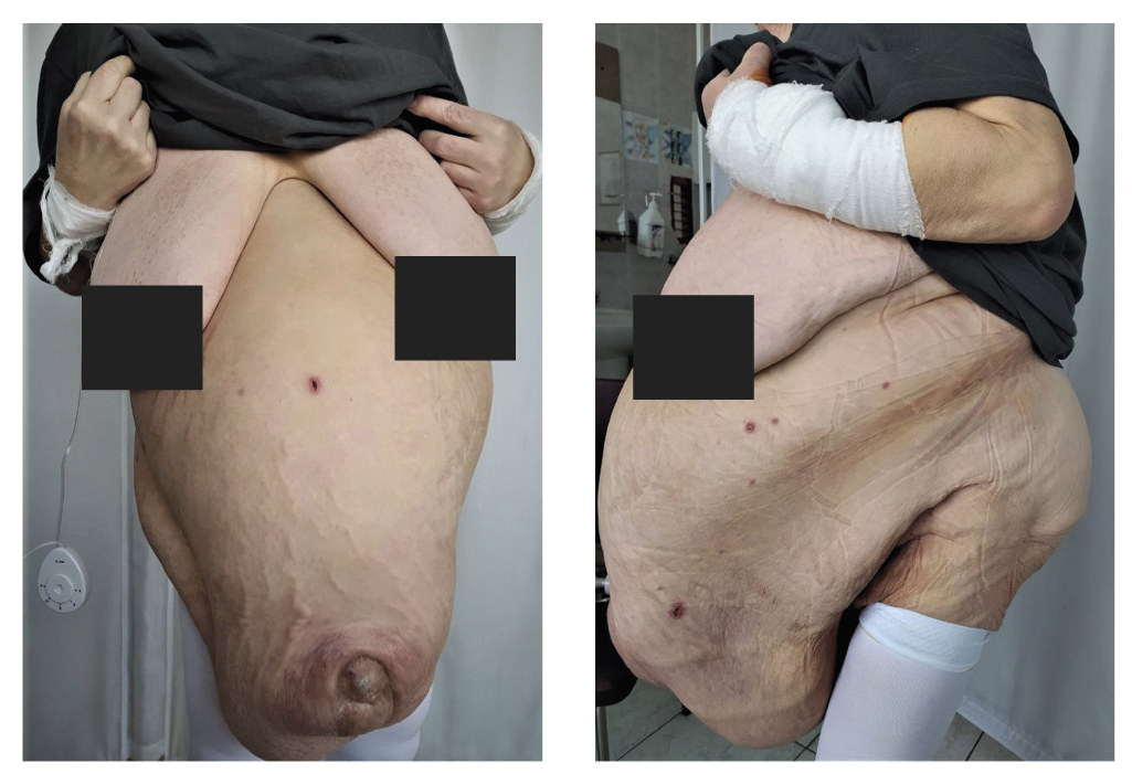 Анамнез жизни: беременностей 5, из них родов — 1, абортов — 4. Рост 155 см, масса тела 109 кг, индекс массы тела 45,4 кг/м2. Самостоятельно больная передвигаться не могла из-за огромного объема опухоли.