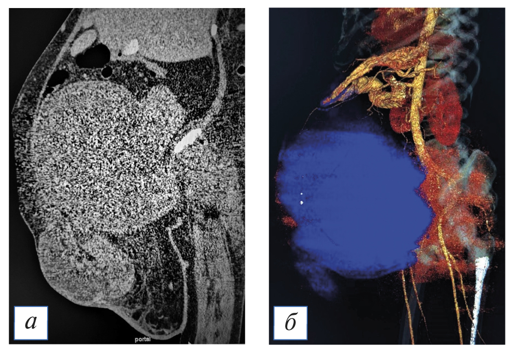 Рис. 2. Результаты инструментального обследования: а — компьютерная томография органов брюшной полости; б — 3D-реконструкция по данным компьютерной томографии, в результате которой было оценено расположение опухоли по отношению к крупным сосудам брюшной полости. / Fig. 2. Results of instrumental examination: а — computed tomography of abdominal organs; б — 3D reconstruction according to computed tomography, as a result of which the location of the tumor in relation to large vessels of the abdominal cavity was estimated.