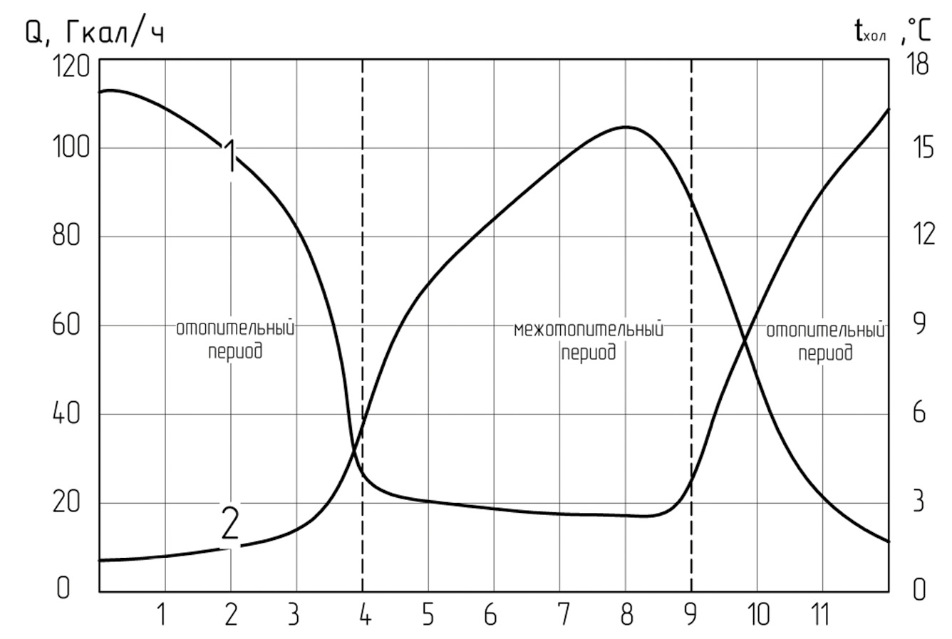 Рис. 1. Изменения среднемесячной тепловой нагрузки — 1 и температуры холодной воды на подпитку — 2 за 2022 год