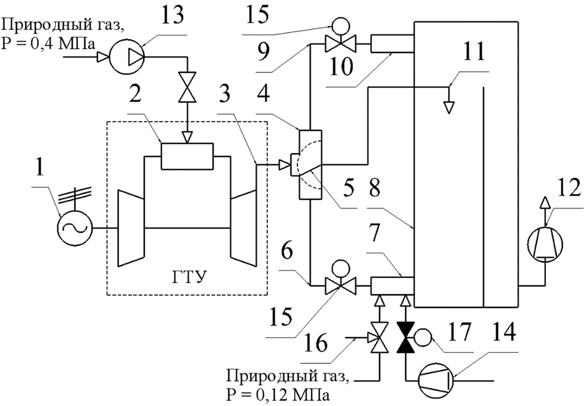 Рис. 2. Схема когенерационной установки: 1 — электрогенератор; 2 — камера сгорания ГТУ; 3, 6, 9 — газоходы; 4 — тройник; 5 — шибер, поддерживающий оптимальный коэффициент избытка кислорода в топочной камере в диапазоне α = 1,05–1,1; 7 — горелки котла; 8 — котел; 10 — регистр; 11 — датчик кислорода; 12 — дымосос; 13 — дожимной компрессор; 14 — штатные дутьевые вентиляторы; 15, 17 — газоплотные клапаны; 16 — кран шаровой трехходовой