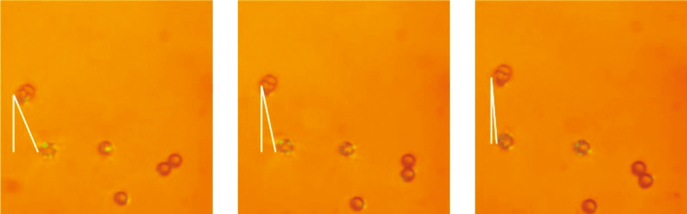 Рис. 2. Кадры из эксперимента по оптическому повороту латексных микросфер при дефокусировке лазерного пучка в форме вершин треугольника