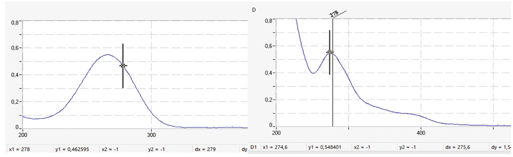 Результаты. При проведении УФ-спектрофотометрии максимум поглощения ацетонового извлечения был отмечен при длине волны 265 нм. Стоит отметить, что полученные спектры поглощения ацетонового извлечения сиропа и исходной субстанции сиропа схожи между собой (рис. 2).